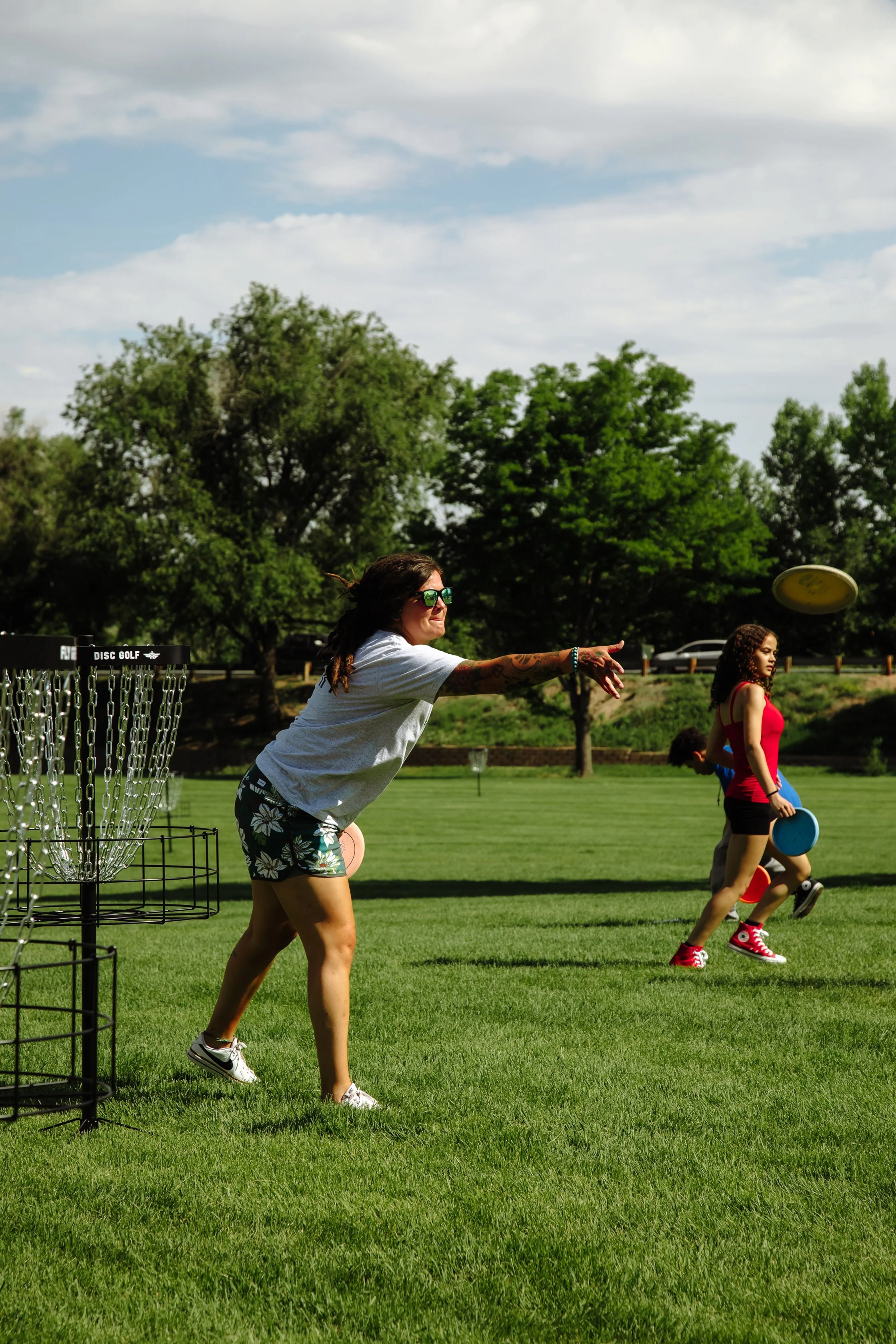 We begin by letting everyone attempt several putts from 30 feet, with a scorecard to reference and track your progress throughout the day. Next, everyone makes several drives, and we record your initial stats. Then, we teach you the physics of throwing the disc, ex. how to put spin on the disc and other pro tips. We even have a snazzy radar gun to track your throwing speed! Finally, we revisit putting and driving once more so participants can see how much they’ve grown in such a short span of time. Congrats! You’re an official disc golfer now!